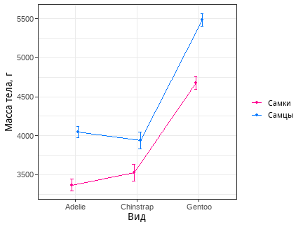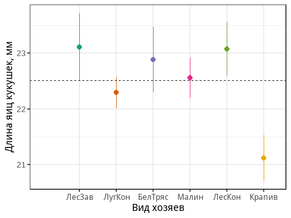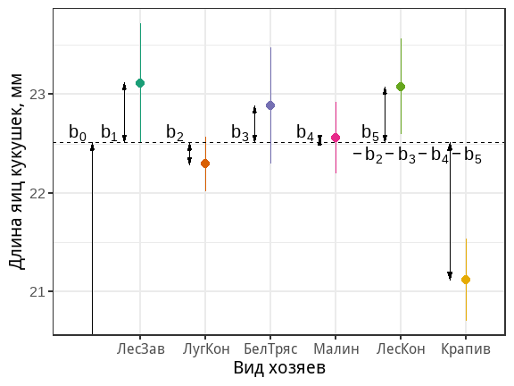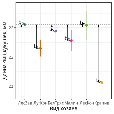 class: middle, left, inverse, title-slide .title[ # Дисперсионный анализ, часть 2 ] .subtitle[ ## Линейные модели… ] .author[ ### Марина Варфоломеева, Вадим Хайтов, Анастасия Лянгузова ] .date[ ### Осень 2025 ] --- ## Многофакторный дисперсионный анализ - Модель многофакторного дисперсионного анализа; - Взаимодействие факторов; - Несбалансированные данные, типы сумм квадратов; - Многофакторный дисперсионный анализ в R; - Дисперсионный анализ в матричном виде. ### Вы сможете - Проводить многофакторный дисперсионный анализ и интерпретировать его результаты с учётом взаимодействия факторов. --- class: middle, center, inverse # One Way ANOVA Update: Линейные контрасты --- ## Открываем данные ``` r library(DAAG) data("cuckoos") # Положим данные в переменную с коротким названием, чтобы меньше печатать eggs <- cuckoos head(eggs, 3) ``` ``` length breadth species id 1 21.7 16.1 meadow.pipit 21 2 22.6 17.0 meadow.pipit 22 3 20.9 16.2 meadow.pipit 23 ``` ``` r # Сократим названия переменных colnames(eggs) <- c('len', 'br', 'sp', 'id') ``` --- ## Изменим названия уровней фактора, чтобы было легче понять о каких птицах речь ``` r levels(eggs$sp) ``` ``` [1] "hedge.sparrow" "meadow.pipit" "pied.wagtail" "robin" "tree.pipit" [6] "wren" ``` ``` r levels(eggs$sp) <- c("ЛесЗав", "ЛугКон", "БелТряс", "Малин", "ЛесКон", "Крапив") ``` --- ## Как понять, какие именно группы различаются Дисперсионный анализ говорит нам только, есть ли влияние фактора, но не говорит, какие именно группы различаются. Коэффициенты линейной модели в `summary(mod_treatment)` содержат лишь часть ответа --- сравнение средних значених всех групп со средним на базовом уровне. Если нас интересуют другие возможные попарные сравнения, нужно сделать пост хок тест. --- ## Есть два способа понять, какие именно группы различаются -- .pull-left[ .center[__Post hoc__ тесты] - Сравниваются все возможные группы. - Нет четких заранее сформулированных гипотез. - Делать можно, только если влияние соответствующего фактора оказалось значимым. Этот способ мы уже обсуждали на предыдущей лекции. ] -- .pull-right[ .center[__Линейные контрасты__ (linear contrasts)] - Гипотезы о межгрупповых различиях тестируются при помощи комбинаций из коэффициентов линейной модели. - Набор гипотез (и сравнений) **должен быть определен заранее**. - Делать можно вне зависимости от результатов дисперсионного анализа. Этот способ за рамками курса. Однако в некоторых отраслях это важно, мы обсудим лишь общую суть линейных контрастов. ] --- ## Применение линейных контрастов Когда нам нужны только какие-то определённые группы сравнения, а не все группы со всеми сразу. Модель сравнения записывается в форме модельной матрицы. Для начала разберёмся со сравнением двуx групп в модели, заданной параметризацией индикаторов. Допустим, мы хотим сравнить лугового конька с белой трясогузкой. Возьмём лугового конька в качестве референсной группы. В таком случае можно оценить контраст для неё как: `\(L_1 = 1 * b_{ЛугКон} = 1 * b_{ЛугКон} + 0 * b_{БелТряс}\)`. Данное значение будет идентично интерсепту в R. Контраст для второй группы сравнения можно записать как разница между средним значением в ней и референсным значением: `\(L_2 = 1 * b_{БелТряс} - 1 * b_{ЛугКон}\)`. Таким образом, получаем матрицу следующего вида: <div class="math"> \[ \begin{array}{cc} & \begin{vmatrix} 1 & 0 \\ 1 & -1 \end{vmatrix}\end{array} \] </div> --- ## Линейные контрасты Так же, как в случае записи модельной матрицы, такая полная запись несколько излишня, поскольку нас интересует только та часть матрицы, которая соответствует __сравнению__ между двумя группами. Т.е. БелТряс --- ЛугКон = <div class="math"> \[ \begin{array}{cc} & \begin{vmatrix} 1 & -1 \end{vmatrix}\end{array} \] </div> __НО!__ В 